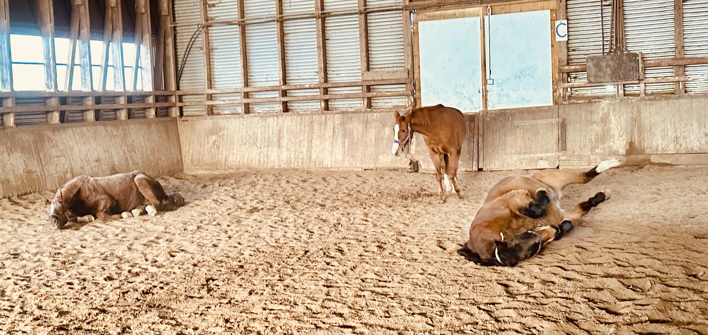 Unsere Pferde dürfen sich bei Frost in der Halle austoben und wälzen. Sie genießen das sichtlich.