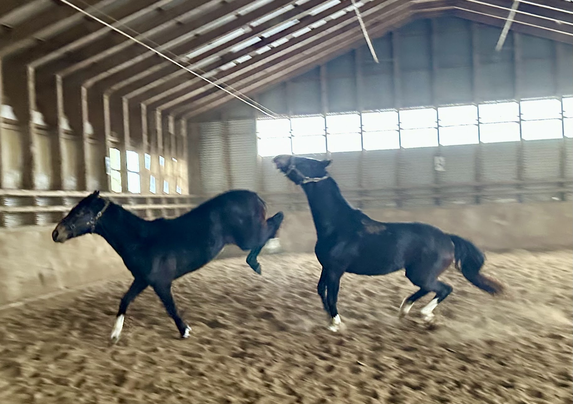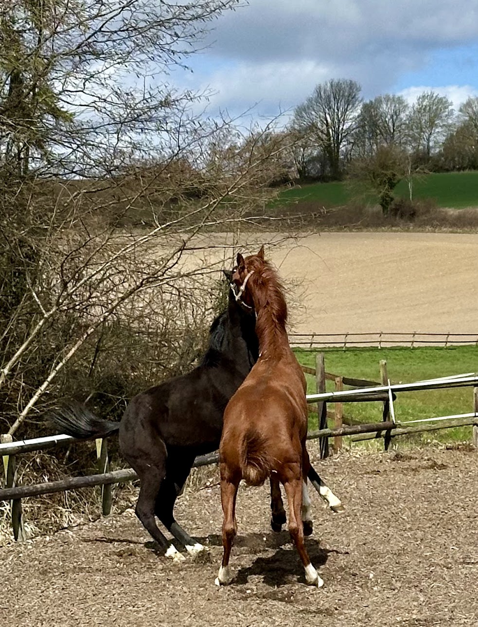 Den beiden Hengstfohlen vom letzten Jahr kann man den ganzen Tag zu schauen, wie sie zusammen spielen. (April26)
