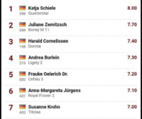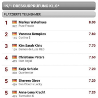 Quarterstar und ich konnten uns Karfreitag auf dem besonderem Reitturnier Bad Schwartau 2024 zweimal platzieren. In der M** tanzte sie zum Sieg, was mit wunderschönen Ehrenpreisen belohnt wurde und im St Georg Special wurden wir 6. mit vielen 8ten und sogar 8,5en im Protokoll. Auch Heike Bähnke platzierte sich mit einem sehr schönen Ritt 7,7 an 3. Stelle in der L Dressur.(März 2024)