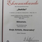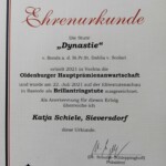 Auch für Dahlias erste Fohlen gab es aufgrund ihrer Eigenleistung eine Urkunde. Schon als Fohlen hat sie uns alle verzaubert. Dynastie von Bonds nun im Besitz von Gut Schönweide, die sie letztes Jahr erfolgreich bis zur Brillantringstute mit Hauptprämienanwartschaft brachten. Auch in der Zucht konnte sie mit ihrem ersten wundervollen, sehr beweungsstarken Fohlen von Follow him überzeugen. Wir wünschen dem Gut Schönweide weiterhin viel Erfolg und Freude mit ihr. ( Juni 2022)