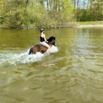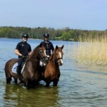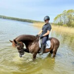 Zur Belohnung ging es den Tag darauf baden im Kellersee. Wir wohnen so schön hier, dass wir unseren Pferden immer wieder Abwechslung bieten können. Quarterstar, die sonst eher wasserscheu ist, genießt die Abkühlung und das Planschen. (Juni 2022)