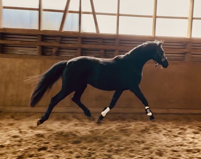 Wir sind überaus glücklich, dass wir die bei uns 2023 geborene Rappstute von Infantino aus Donauherz/ De Niro in sehr liebevolle Hände vermitteln konnten. Hier begeistert sie die Familie täglich mit ihrem Charme und ihrem Charakter, so dass sie in kürzter Zeit schon mit Sattel und Trense unterwegs ist.